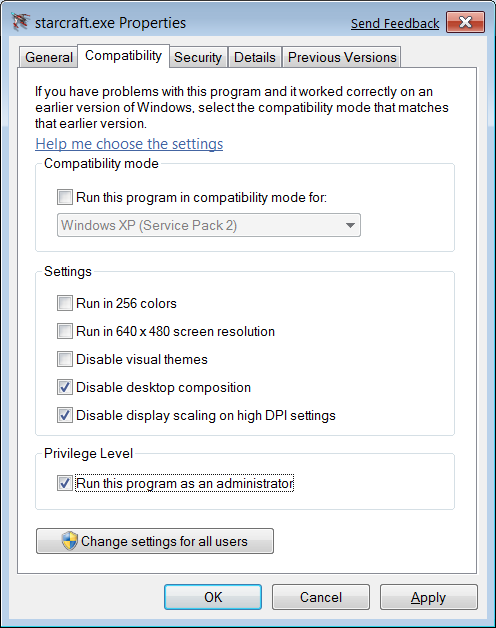 I tried various settings on compatibility mode without real success. Setting compatibility mode to Windows XP (where game looks good) made things even worse since Starcraft started reporting that it cannot load a file (font\font.gid). Neither combination of settings got palette problem solved.
