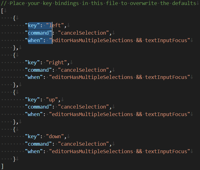 While that sorts out column selection key shortcut, it still leaves one annoying problem - if you move cursor in any direction while multiple lines are selected, you will see multiple cursors move - instead of more usual selection cancellation. Fortunately, you can add a few key bindings in keybindings.json to deal with that issue: