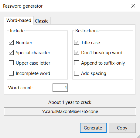 Classic password generator will allow you selection of password length and what it will consist of. You can choose between lower and upper letters, numbers, and special characters. Length can be anywhere between 4 (you’re crazy) and 99 (you’re paranoid) characters. For those of weak heart, generated passwords can be simplified a bit. It is pretty standard stuff really.