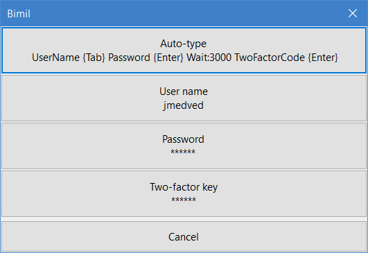 Followers of XKCD have probably seen his word-based password cartoon. For those taking his (actually quite good) recommendation to heart, Bimil now allows for random generation of just such passwords. It has a database of over 15,000 English words and 12,000 names so it should provide reasonable variety. Additionally it allows for further strengthening by using numbers and special characters so good entropy can be achieved even if somebody knows exactly which dictionary you used.