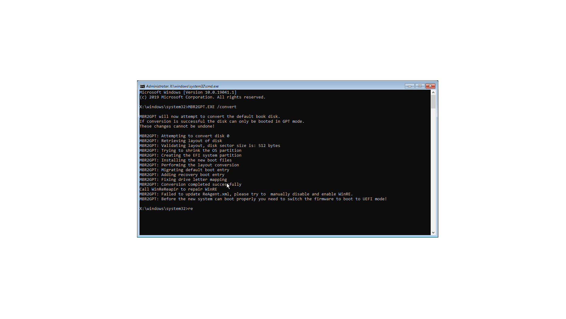 mbr2gpt.exe /convertThis command will be done in less then a minute. You might get a warning about WinRE but don’t worry about that right now. Next, you power off the system using Turn off your PC option.