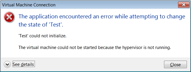 After installing Windows Server 2008 R2 in this manner and additional installation of Hyper-V role, everything seemed fine. Creating virtual machine went without a hitch. Only when I tried to start it, I got “The application encountered an error while attempting to change the state of ‘Test’”. Third line held a issues “The virtual machine could not be started because hypervisor is not running.”. Looking into details, there was one possible cause that applied here - incorrect boot configuration.