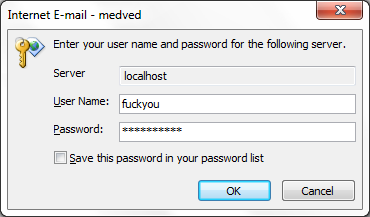 Let’s imagine a scenario in which your server temporarily refuses connection. Outlook detects that password/user-name fails and decides to ask you. Since this is so important it shows window in foreground as A FUCKING TOP-MOST window. You dismiss it with cancel in order to continue with your work. In three seconds FUCKING TOP-MOST window reappears and you click it away, again. And it appears again. And you dismiss it again. And you start writing something only to have that FUCKING TOP-MOST window steal focus again. Most viruses/worms/diseases I know are not annoying as much as Outlook 2010.