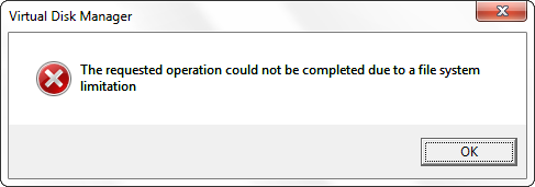 As soon as I created virtual disk I was greeted with “The requested operation cannot be completed due to file system limitation”. Even worse, you cannot attach already existing VHD that happens to be there. It simply refuses to do anything.