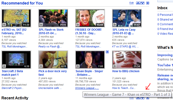 I was quite surprised when I saw Susan Boyle video among those recommended for me. Fortunately YouTube also told me why. That left me even more puzzled since YouTube though that I would like Susan because I watched Starcraft Winners League match between Samsung Khan and Estro. I dare not think how many Starcraft fans watched both those videos for YouTube to connect them.
