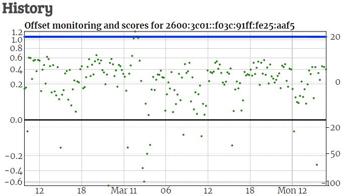 ntpdate -q ^^<ip>^^Once server works for a while, it can be added to the NTP.org pool. Since the server has both IPv4 and IPv6 address (I surely hope you added IPv6 ;)), it will be necessary to add it twice. At the start it will be only monitored but, as its score increases, soon you will start seeing traffic from all over the world.