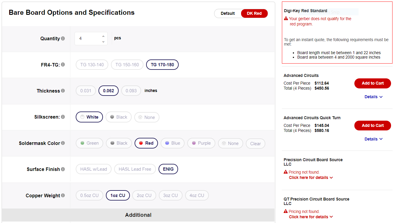 On surface it looks good. Board requirements are reasonable. If you want to use DKRed service you need to have your design fit 5/5 mil minimum - more than sufficient for all I do. While more detailed specifications are available for other PCB vendors on their platform (albeit Royal Circuits has a bad link), there’s nothing about DKRed itself. Yes, I know DKRed might use any of manufacturer’s behind the scene but I would think collating minimum requirements acros all of them should be done by DigiKey and not left to a customer.