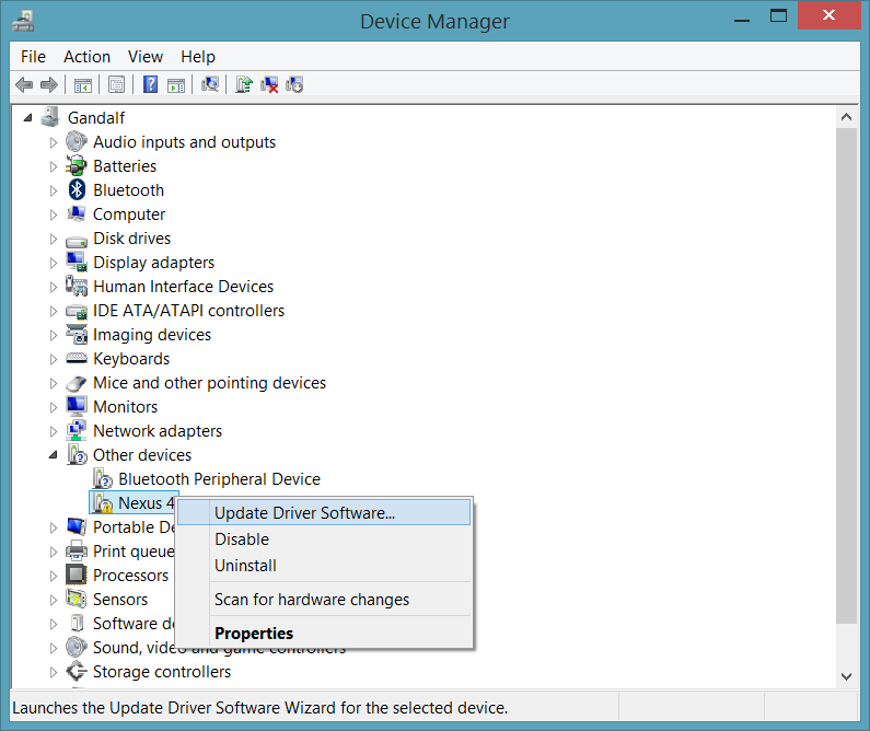 We’ll definitely need to download Google’s USB drivers. Once you download and unpack the archive, you’ll need to go to Device Manager and find your Nexus device with an exclamation point next to its name. Right-click, Update Driver Software, and select location where you unpacked the driver zip file. Your device should then be named Android ADB Interface.