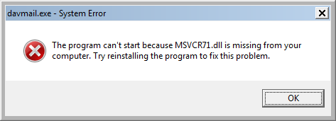 I went into “C:\Program Files (x86)\Java\jre6\bin” folder and copied “msvcr71.dll” from there to DavMail’s application folder (“C:\Program Files (x86)\DavMail”). This way DavMail found his dll and everybody was happy.