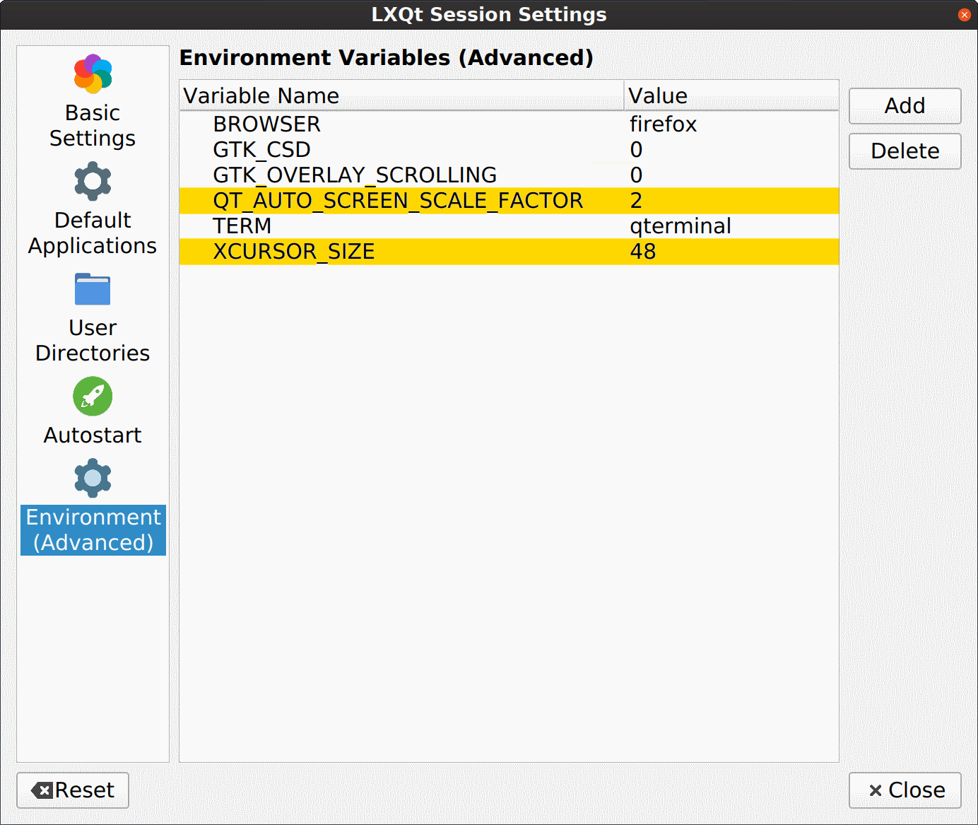 That said, where do you set them? Just go to Preferences, LXQt settings, Session Settings, Environment (Advanced) and add those two environment variables.