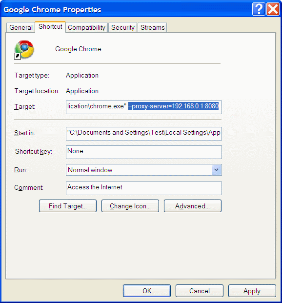 Fortunately, there is small command line option that will take care of this. All you need to do is to modify shortcut pointing to Google Chrome. In Target text you should just append --proxy-server=192.168.0.1:8080 where 192.168.0.1 is address of proxy server (http and https) you wish to use and 8080 is port where proxy server is listening. Of course your proxy server data may be different. :)