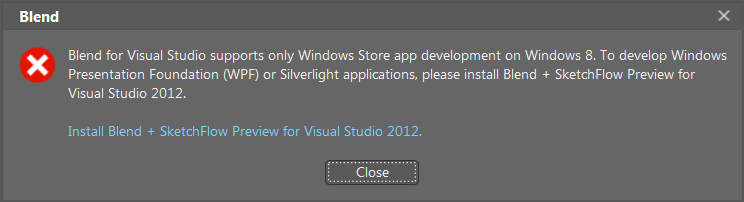 Therefore I was surprised when I actually started Blend under Windows 7. I got slapped with “… supports only Windows Store app development on Windows 8 …”.