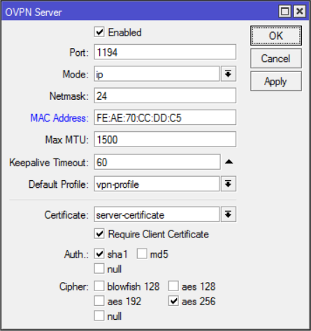 set default-profile=vpn-profile certificate=server-certificate require-client-certificate=yes auth=sha1 cipher=aes128,aes192,aes256 enabled=yesNow finally we can copy both ca.crt and client.crt to C:\Program Files\OpenVPN\config\ directory alongside client.ovpn.
