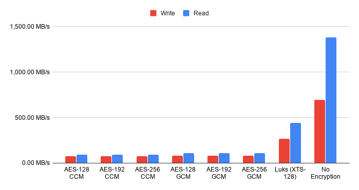 I was quite surprised how close a different bit sizes were in the performance. If your processor supports AES instruction set, there is no reason not to go with 256 bits. Only when you have an older processor without the encryption support does the 128-bit crypto make sense. There was a 15% difference when it comes to the read speeds in the favor of the GCM mode so I would probably go with that as my cipher of choice.