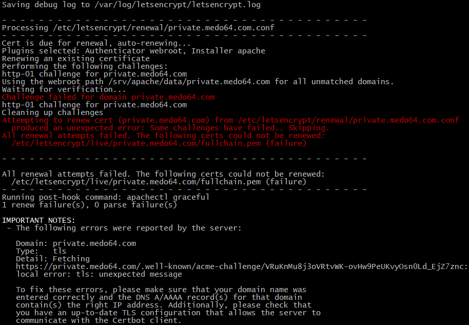 Guess what? Let’s Encrypt doesn’t have knowledge of my client certificate and thus handshake fails. Error message is not really helpful as “tls: unexpected message” doesn’t really point you to the correct path. Fortunately, I actually remembered my certificate shenanigans and thus was able to debug it quite quickly. Issue verification was as easy as dropping certificate requirements made my renewal work again.