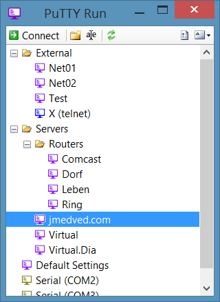 PuTTY Run is program that runs in tray notification area, responds to Ctrl+Shift+P and allows you to organize PuTTY sessions a bit. All is done in backward compatible way so you can continue using same sessions in both PuTTY and PuTTY Run. Actual session.