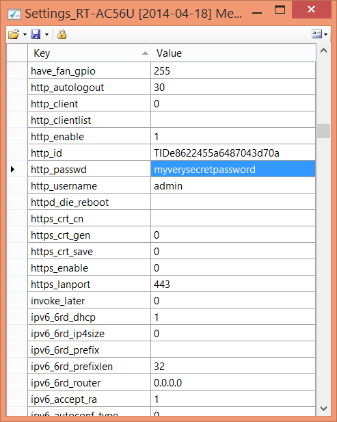 What WRT Settings allows is to view (and edit) NVRAM configuration files for AsusWRT (including Merlin’s variant), Tomato and DD-WRT. You can even save them as text which allows you to compare and merge different configurations. Comes in especially handy when you want to share settings between two routers without overwriting router-specific variables (e.g., MAC addresses).